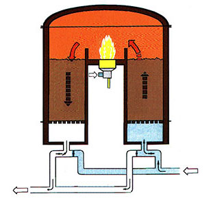 一个循环完成后,进气与出气阀门进行一次切换,改变气流方向(进入下一循环)。废气由蓄热室B进入,净化后的气体由蓄热室A排放。如此不断地交替进行。